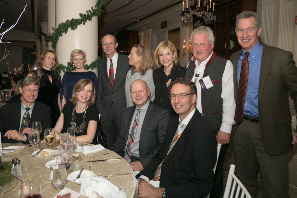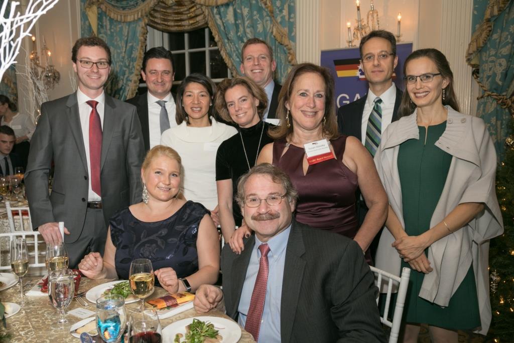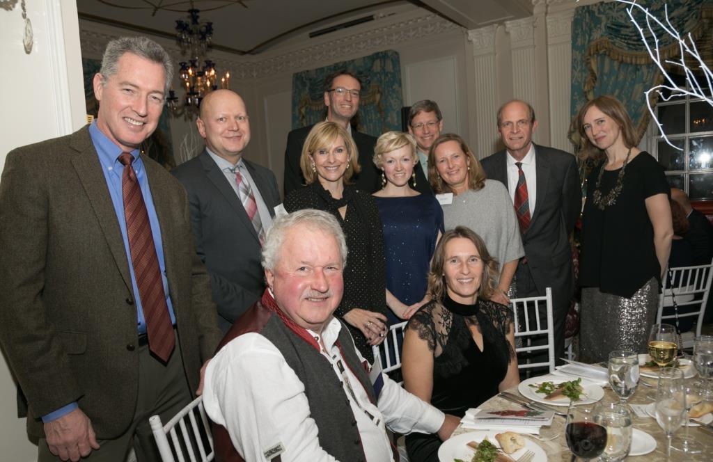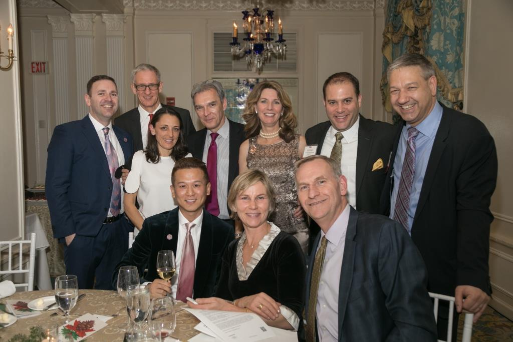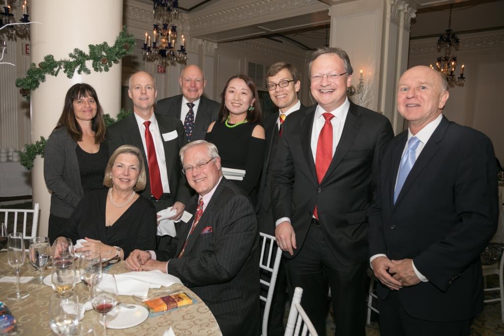 The corporate table for CollegeFindMe, hosted by Christina Bai (in blue) with guests including Setti Warren, Mayor of Newton and democratic candidate for governor (seated center) and also (retired) German Consul General Friedrich Loehr (far right).
