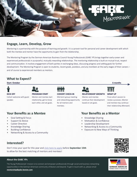 Join the German-American Business Council Young Professionals (GABC YP) Mentoring Program as a MENTOR or a MENTEE.